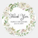 Hermoso boda redondo gracias pegatina presenta elegantes rosas blancas alrededor de la frontera. Gracias está escrito en un sofisticado guión negro. Los nombres de las parejas de bodas están escritos en un sencillo y clásico tipo de letra serif.