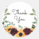 Complete su boda de girasol con estos hermosos pegatinas de agradecimiento perfectos para los favores de boda o sobres. Este diseño cuenta con girasoles rústicos amarillos y rosas burdeos con vegetación.