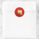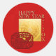 Rojo de papel cortado (imagen impresa) en la esquina de una plaza dorada + 12 signos zodiacos en una antigua moneda china con saludo en inglés en la parte superior (letras doradas y sombra de gota no personalizable). Diseño en pegatina redondo. Tarjeta de felicitación coincidente, postal de vacaciones, invitación y más... Perfecto para el Año Nuevo Chino del Occidente 2021.