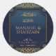 Pegatina de Ronda Clásico de la Boda Musulmana Floral Real Azul y Oro pegatina redondo, bañado por un relajante tono azul oscuro real, adornado con delicados motivos florales dorados que exudan elegancia y opulencia. La caligrafía árabe "Bismillah" honra con gracia la parte superior, invocando bendiciones divinas a la pareja. El pegatina presenta los nombres de la pareja, un sincero mensaje de "Gracias", sus saludos y la fecha boda, todo presentado elegantemente en una tipografía refinada. Este clásico pegatina redondo es la adición perfecta a los favores matrimoniales, añadiendo un toque de elegancia real y expresando gratitud a los invitados por compartir en el día especial de la pareja.