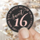 Añada una moda y un toque de acabado a la moda a los sobres y favores con estos dulces y rosados pegatinas de 16º cumpleaños. El diseño presenta una tipografía de escritura de estilo manuscrito de color rosa ondulado sobre un fondo negro moderno. El texto en un círculo es sencillo para el personalizar. Estas elegantes etiquetas le dan un toque elegante y bonito a la dulce decoración de fiestas de 16 años. Perfecto para usar como sellos para sobres para notas de agradecimiento.