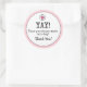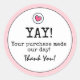 Si estás buscando una manera colorida, quizás única y dulce de agradecer a los clientes por su compra, puedes apreciar este divertido retro inspirado en Rubor Pink "Yay! ¡Tu compra ha hecho nuestro día!" (Con el corazón) Negocios Gracias Pegatina de Ronda Clásica de Zazzle! Disponible en hojas pequeñas de 20 y grandes de 6 en acabado brillante o mate. Vendidos por la hoja o en cantidades de 2-500 (hojas). Compra el texto como está o personalizar fácilmente el texto en el frente para satisfacer tus necesidades de regalos. ¡Perfecto para añadir sobres, embalajes, bolsas de regalo y más! Ahorre cuando compre más - sin mínimos. Garantía de 100% de satisfacción.