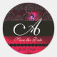 Pegatina Redonda RUBY NEGRO Y ROJO DAMASK MONOGRAM, borgoña