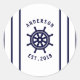 Pegatinas náuticos con apellido y el año siguiente para personalizado. Elija "personalizar esta plantilla" para personalizar el nombre y establecer el año en pegatinas. Los pegatinas marítimos están decorados con rayas azules y blancas de la marina y un timón de barco.