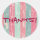 Un pegatina que dice ¡gracias! en un tipo de letra genial. El fondo es una textura rosa y verde rústica de madera maciza.