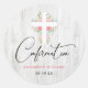 El pegatina Rustic Confirmation Favor presenta cruz floral, escritura tipográfica ''Confirmación'' sobre fondo de madera. Personaliza con un nombre y una fecha.