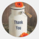 Gracias pegatina con un tema rústico. Una jarra de leche blanca y un par de flores naranjas colocadas alrededor de la lata. Sentado en un granero en un poco de heno. Paneles de madera en el fondo.