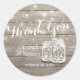 Plantilla de Pegatina de agradecimiento a favor de la boda - Elegante Mason Jar y String Lights en fondo rústico de madera. Un diseño perfecto para tu gran día. ¡Todo el estilo de texto, colores, tamaños se pueden modificar para adaptarlo a sus necesidades!
