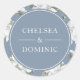 Una plantilla de etiquetas de boda en blanco y azul turbio donde puede crear su propio pegatina personalizado de novia y novio para complementar sus deliciosos favores de boda azules. Añada un toque rústico y elegante a sus favores, regalos e invitaciones con estas elegantes flores blancas color agua minimalistas de inspiración vintage y deja sellos pegatinas verdes.