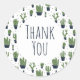 Gracias pegatinas con un sabor rústico occidental. Diseñado con un montón de cactus verdes lindos en un patrón repetido. Específicamente, cactus espinosos de color verde, en todo tipo de formas y tamaños, cada uno sentado en su propio maceta de flores azul oscuro. Pequeños triángulos decorativos entre ellos. Un ilustracion divertido y sensacional.