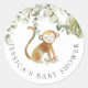 Los pegatinas que prefieren las duchas para bebés cuentan con un ilustracion acuático dulce de un mono, con franjas de hojas de eucalipto y vegetación tropical de la jungla en la parte superior. Diseñado para coincidir con nuestra colección de duchas para bebés Wild One.