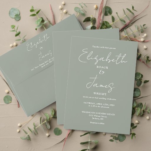 Simple Sage Green Script Wedding Invitation SuiteDiseñado por Pure Piglet Designs