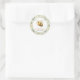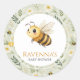 This sage green baby shower sticker features a cute bee surrounded by wildflowers on a soft natural background. The elegant and playful design makes it a perfect personalized party detail.