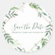 Las hojas verdes salvan el sello para sobres boda de fecha. verde bonito Cambia el pegatina de fechas para finalizar tus invitaciones y enviarlo a tus invitados. Este moderno pegatina Guardar la fecha muestra sus nombres y la fecha de boda con el borde botánico de hojas de color verde bonito y "Guardar la fecha" escrito en un guión elegante verde coincidente. Puede cambiar los colores del texto para que se ajusten a su propio estilo.