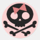 Cráneo pirata de chica y cruces de huesos emblema de la bandera Jolly Roger, blanco y negro con un arco rosado. Camisetas, tarjetas de caramelos, regalos.