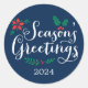 El diseño redondo de la etiqueta / sello de sobre de vacaciones presenta el texto "Saludos de temporada" en blanco, rojo y verde con un color de fondo azul marino (se puede personalizar). Texto personalizado para el año.