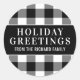 El diseño de pegatina de vacaciones cuadradas incluye un mensaje de Saludos de vacaciones personalizado que puede personalizarse con su apellido o apellido. El texto está enmarcado por un fondo de fondo con motivos de chapa de búfalo blanco y negro.
