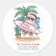 Santa de Navidad montando un dinosaurio Dirección de devolución Pegatina redonda clásica