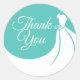 Sapphire azul elegante vestido con ducha de novia gracias, pegatina redondo clásico con un elegante vestido de novia en un fondo azul zafiro con un hermoso guión de letra blanca. Perfecto para sellos para sobres y pegatinas.