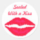 Pegatina blanco con lápiz labial rojo y rosado caliente y "Sellado con un beso" arriba.
