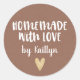 Un pegatina "casero con amor" personalizado con un corazón dorado sobre un fondo color terra marrón texturizado. Hazlo tuyo añadiendo tu propio nombre. Un toque de bonito para todos tus regalos caseros. Diseñado para ti por Blackberry Boulevard.