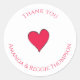 Este diseño presenta un corazón rojo lindo y elegante sencillo, etiqueta de favor de fiesta de aniversario, un dibujo animado divertido y caprichoso, una pegatina clásica simple y moderna, texto de tipografía simple de gracias, personalizar nombre personalizado, una fiesta de pareja de boda de aniversario, una cena de compromiso del novio comprometido, reunión de fiesta de boda, suministros de fiesta de celebración de celebración