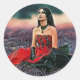Una huella romántica de un Chica gótico sentado afuera con un hermoso vestido. Retrabajé la imagen en tonalidades más audaces de verde, rojo y morado para crear un pegatina que a cualquier seguidor del género gótico romántico le encantará. Elegante y elegante, una imagen muy llamativa y personalizable a tu gusto.