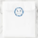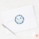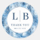 This wedding sticker features a circular design with a serene wintry forest theme, showcasing stylized pine trees in various shades of blue. The cool color palette includes light and dark blues set against a crisp white background, creating a calming and cohesive look. Elegant serif typography is used for the "THANK YOU" message, adding a touch of formality to the whimsical style. Perfect for expressing gratitude at your special event, this sticker combines a balanced composition with a festive mood, making it an ideal addition to any wedding celebration.