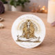 Este pegatina redondo presenta una mujer serena mediadora ilustrada en tonos sepia y oro. Adornado con las palabras "Paz, Mentalidad, Gracia, Om Shanti", encarna la tranquilidad y la armonía espiritual, lo que lo convierte en una adición perfecta a tu yoga o espacio de meditación.