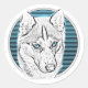 Siberian Husky mit blauen Augen. Zeichnung, Kopf umrahmt von einem gestreiften Kreis. blau/weiß
