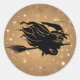 Silueta negra de una bruja volando por la noche en su escoba. Algunos diseños tienen más de una bruja volando como si estuvieran en formación. Algunas tienen un fondo de color naranja-dorado con estrellas.