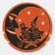 Un encantador, vintage, Halloween, ilustracion de silueta de una vieja bruja, sentada en una luna creciente, con una cara, leyendo un periódico o un libro, con su gato negro. Muy lindo y simple. Ideal para los que aman Halloween, gatos negros, brujas, lunas de media luna, los colores naranja y negro, ,arte vintage o ilustraciones de silueta.