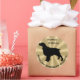 Espléndida silueta negra de un perro de caza de aves español Springer inglesa ambientada en un fondo semitransparente de explosión de sol. Elegimos un oro amarillo, pero puedes elegir tu matiz favorito que se mostrará a través de un poco apagado. Dos líneas de texto de personalizable una arriba y una curva abajo.