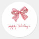 Simple acuarela Red Candy Stripe Bow Happy Holidays Round Pegatina con un saludo editable en letra estilo escritura a mano.