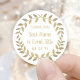 Agregue un toque final personalizado a los recuerdos de la fiesta y las notas de agradecimiento con etiquetas redondas de corona de laurel personalizadas. Todo el texto de esta plantilla es fácil de personalizar para cualquier ocasión, como boda, despedida de soltera, graduación, fiesta de cumpleaños, aniversario o jubilación. Cambie o elimine cualquiera de los textos para hacer sellos de sobre para invitaciones, anuncios o guarde las fechas. El diseño botánico moderno en dorado y blanco presenta una corona de laurel de lámina de imitación, caligrafía rústica y tipografía clásica y elegante. Tenga en cuenta que el dorado es un color impreso, no lámina metálica. Estas etiquetas redondas elegantes agregan un toque único y personalizado a la celebración de un día especial.