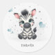 Cute baby shower or birthday sticker featuring adorable little male zebra with some blue love hearts