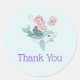 Gracias pegatinas con un ilustracion adorable. Diseñado con un chica de sirena de bonito montando un delfín feliz. Un pequeño amigo de medusas los acompaña. Decorada con pequeñas manchas de purpurina de oro falso. Fondo azul claro con puntos de polka rosa descoloridos.