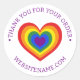 Gracias a los clientes por su negocio con pegatinas de "Gracias por tu pedido" que presentan un colorido corazón arco iris en el centro hecho de corazones concentrados rojos, naranjas, amarillos, verdes, azules y violetas en un fondo blanco. El personalizado de las curvas de texto púrpura rodea el corazón, incluyendo su sitio web o nombre de la compañía. Personalice el texto y agregue su URL en la barra lateral. Copyright ©Claire E. Skinner, todos los derechos reservados.