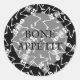Esqueletos sobre un fondo negro y BONE APPÉTIT en letras de moda, estos pegatinas redondos son divertidos por su fiesta de Halloween. COINCIDIENDO con los artículos de nuestra tienda.