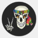 Dale una oportunidad a la paz con este cráneo con una banda psicodélica en la cabeza y ojos encendidos sosteniendo una señal de paz. Este diseño de paz se puede encontrar en prendas de vestir, pegatinas, tazas, imanes, tarjetas y más.