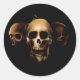 Tres cráneos humanos contra el fondo de negro. Un pequeño criador está mirando desde el cráneo medio.