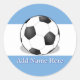A soccer ball on light blue and white background. Custom stickers. Edit name to customize.