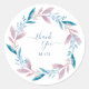 This soft pastel greenery wreath wedding thank you sticker features a delicate watercolor leaf design in muted green, blue, and blush tones. The circular wreath frames your message beautifully and adds a calm, elegant touch. The gentle script typography creates a romantic and timeless look.