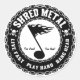 "Vive rápido - Juega duro - ¡Mucha cabeza... demasiado fuerte - ¡Muy malo!" Acelerar el diseño de emblemas metalizado, con notas musicales, cráneos y cadenas. Camisetas, botones, regalos.