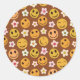Esto es naranja lindo y caras felices sonrientes amarillas con flores retro sobre fondo marrón oscuro.