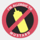 Soy alérgico a los Pegatinas de los símbolos alérgicos de mostaza. Círculo rojo con una línea que atraviesa el cruce de una botella de mostaza. El texto dice "Soy alérgico a la mostaza". Mira todos nuestros otros productos de alergia. Contacto para solicitudes especiales. www.LilAllergyAdvocates.com