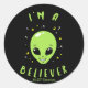 "I'm A Believer" (Soy creyente), gráfico alienígena diseñado por bCreative muestra una cabeza extraterrestre verde sonriente rodeada de lunas y estrellas. ¡Esto es un gran regalo para la familia, los amigos o un regalo para usted mismo! Este gráfico divertido es una gran adición al estilo de cualquiera. bCreative es un creador líder y licenciante de diseños y propiedades originales y de moda. ©LCT Creative. Licencia de bCreative.com