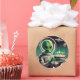 This delightfully weird set of stickers features a vintage-style illustration of a green space alien holding a birthday cake, glowing with lit candles as it stands under a cosmic sky filled with stars, birthday balloons, and a mysterious hovering UFO. It’s an unexpected and totally charming blend of pop surrealism, lowbrow art, retro science fiction, and interstellar whimsy—perfect for anyone who thinks birthdays should be just a little stranger. The alien itself, with its oversized head and expressionless face, stands stoically yet somehow sweetly, as if it’s traveled light years to crash your party with cake in hand. This is the kind of image that walks the line between heartfelt and hilariously uncanny—both celebratory and deeply odd in the best way.