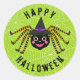 Esta pegatina presenta una araña linda sentada en su tela con su traje de bruja, con medias a rayas, zapatos de bruja y gorra. El texto pegatina es "¡Feliz Halloween!" Arte de Anne Coffey.