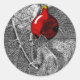 Pen and ink drawing of a squirrel climbing in a Christmas tree. The squirrel is surprised by seeing its own reflection in an ornament. The shiny red ball stands out against the black and white drawing, emphasising how strange it must be to the squirrel to see itself.